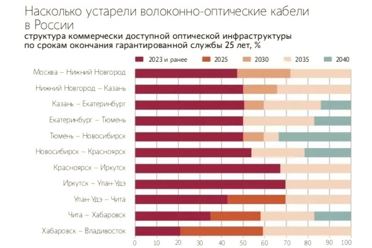 Большинство оптоволоконных кабелей между Москвой и Дальним Востоком исчерпает срок гарантии в 2025 году, что грозит ухудшением связи. Загрузка магистралей уже близка к критической отметке в 70%, сообщил директор по продажам компании «Атлас» Павел Колочкин на Пиринговом.