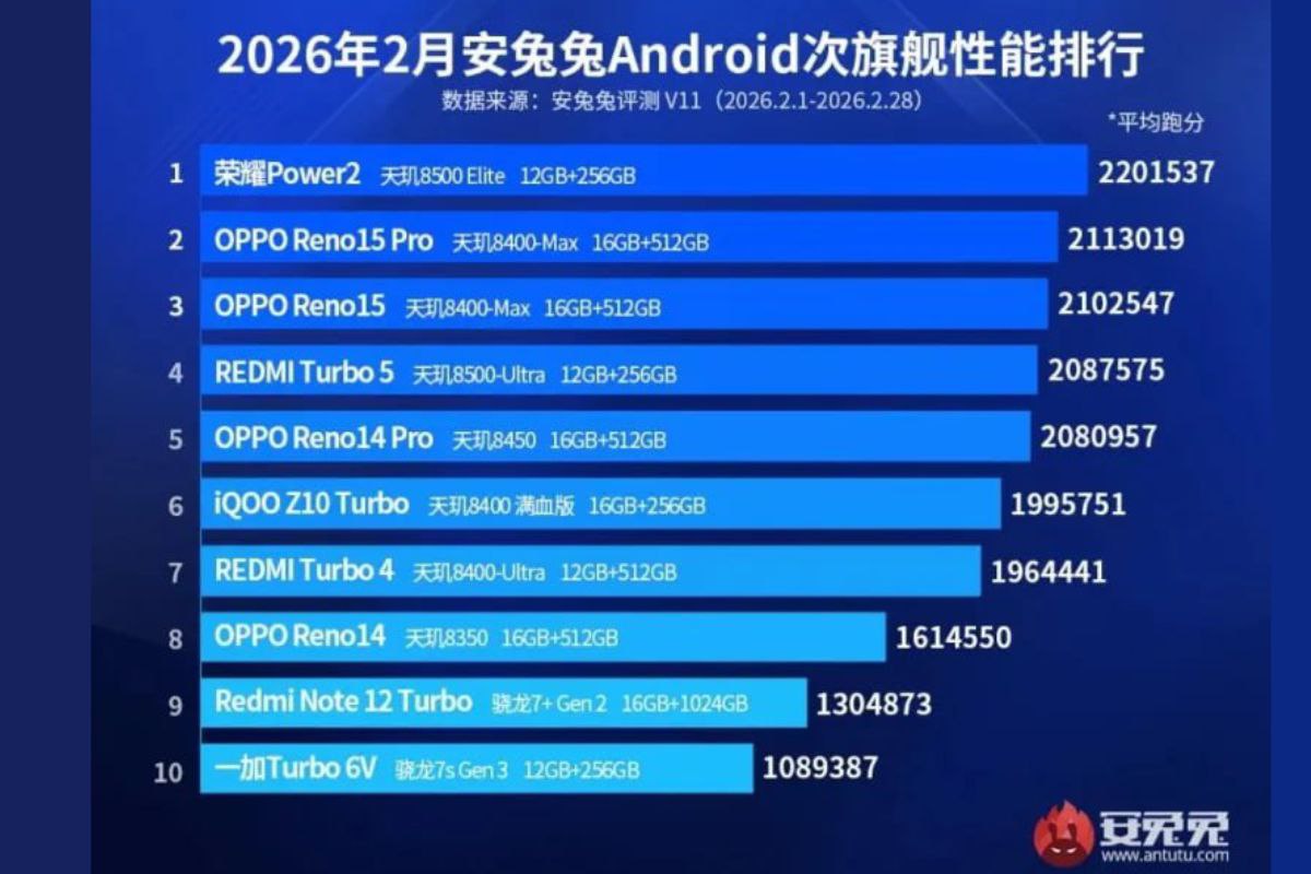 Разработчики бенчмарка AnTuTu опубликовали рейтинг самых производительных субфлагманских смартфонов за февраль 2026 года. Первое место занял Honor Power 2 с результатом 2 201 537 баллов, сообщает Gizmochina.
