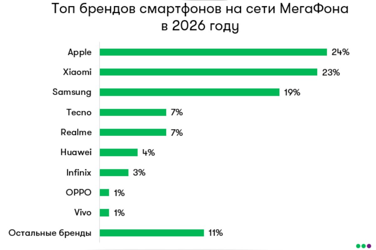 В 2026 году на устройства Apple пришлось 24% всех смартфонов, зарегистрированных в сети оператора «МегаФон». По популярности iPhone обошли Xiaomi, сообщила пресс-служба компании.