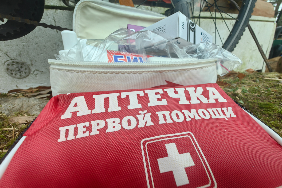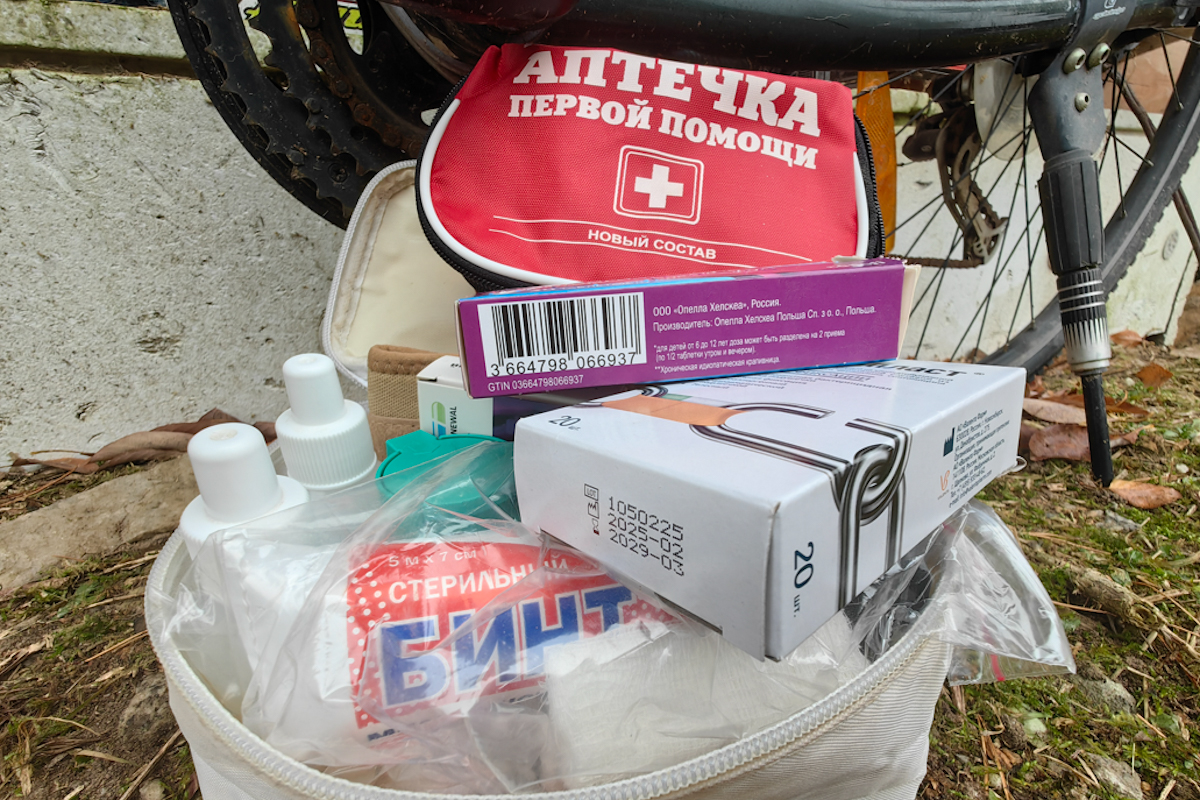 Другим обязательным элементом любого велосипедного путешествия является аптечка. Обычно она укладывается в жёсткую или полужёсткую упаковку. Это исключает повреждение хрупких предметов и предохраняет её от воды. В аптечку стоит положить пластыри, бинты, жаропонижающие и обезболивающие препараты, лекарства от проблем с желудком и кишечником, антигистаминные средства (на случай укусов насекомых или аллергических реакций), средство для регидратации (помогает восстановить баланс электролитов при длительных поездках). Кроме того, важно не забыть лекарства, прописанные врачом, особенно если у путешественника есть хронические заболевания.